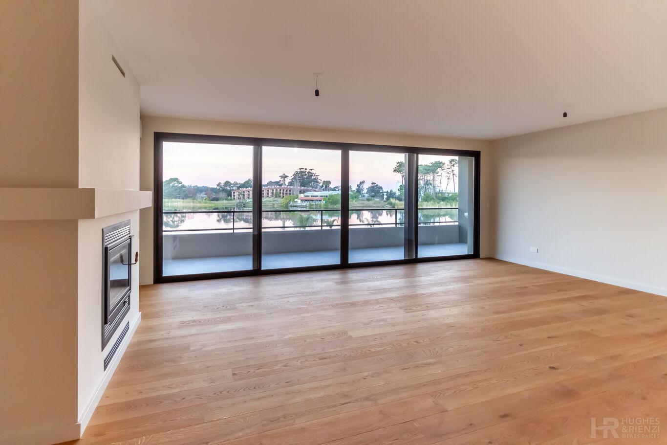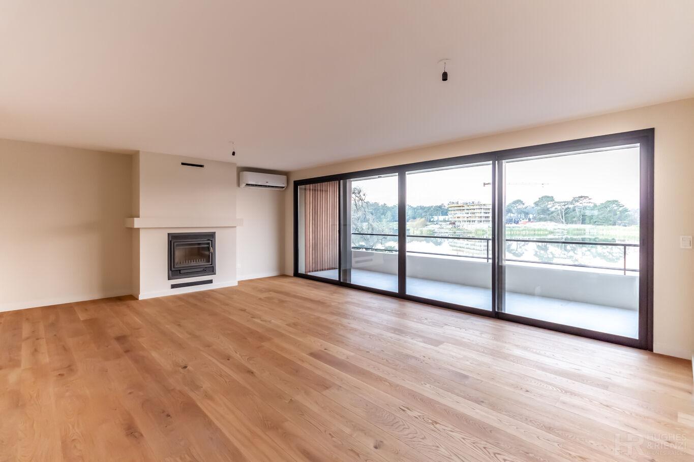 Gran living-comedor con estufa a leña y salida a gran terraza con parrillero, todo con espectacular vista al lago.