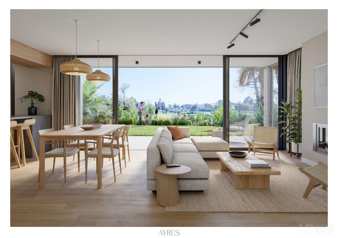 Hacia el Oeste, tres torres de apartamentos con una cálida expresión de arquitectura moderna y vistas a su extenso paisaje. Hacia el Este, unidades independientes con jardines privados.