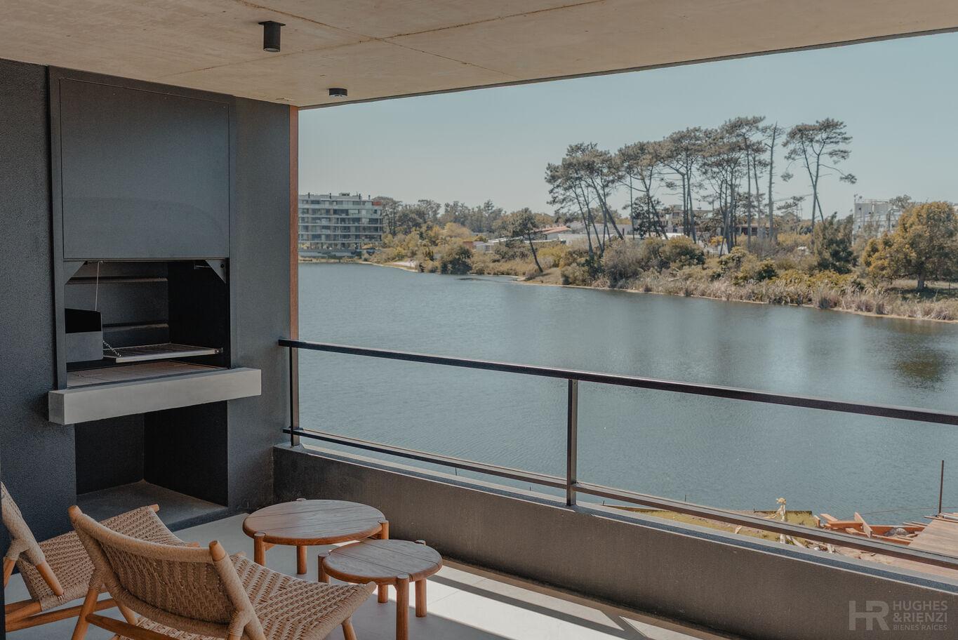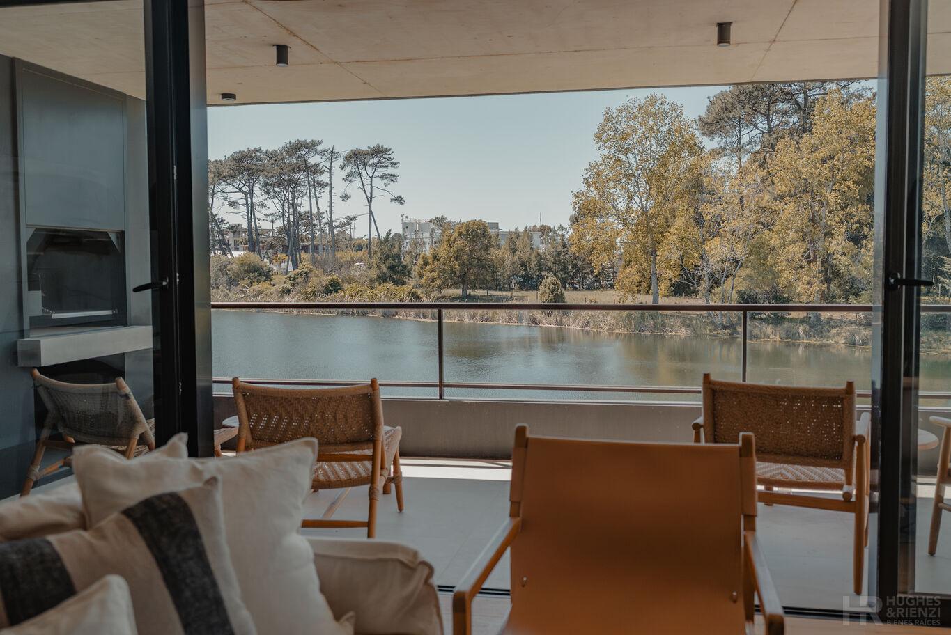 Living comedor con estufa a leña y terraza con parrillero, todo con vista al lago.