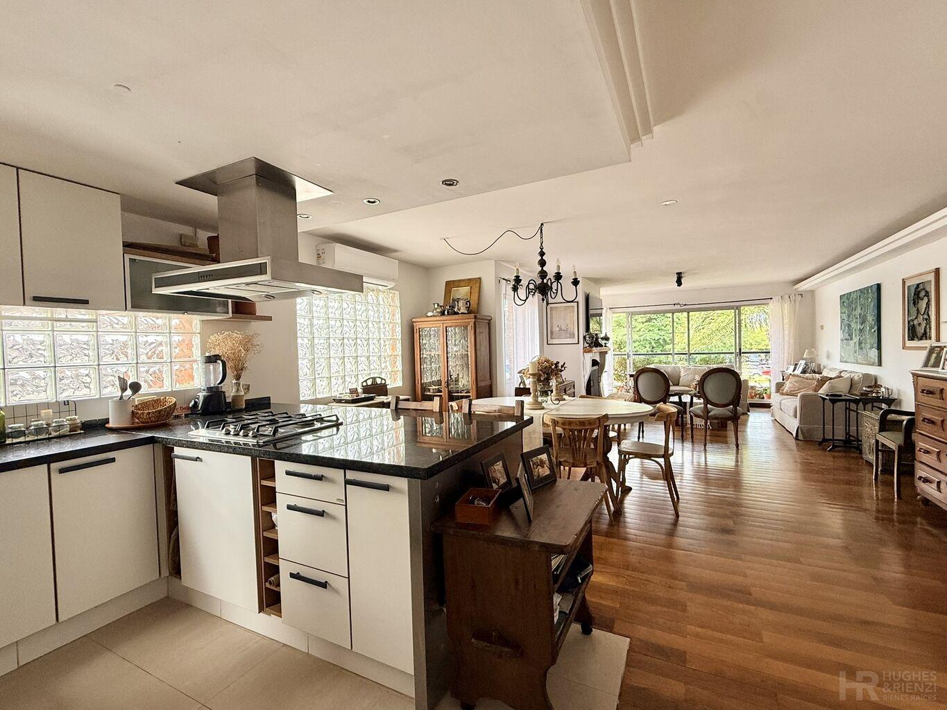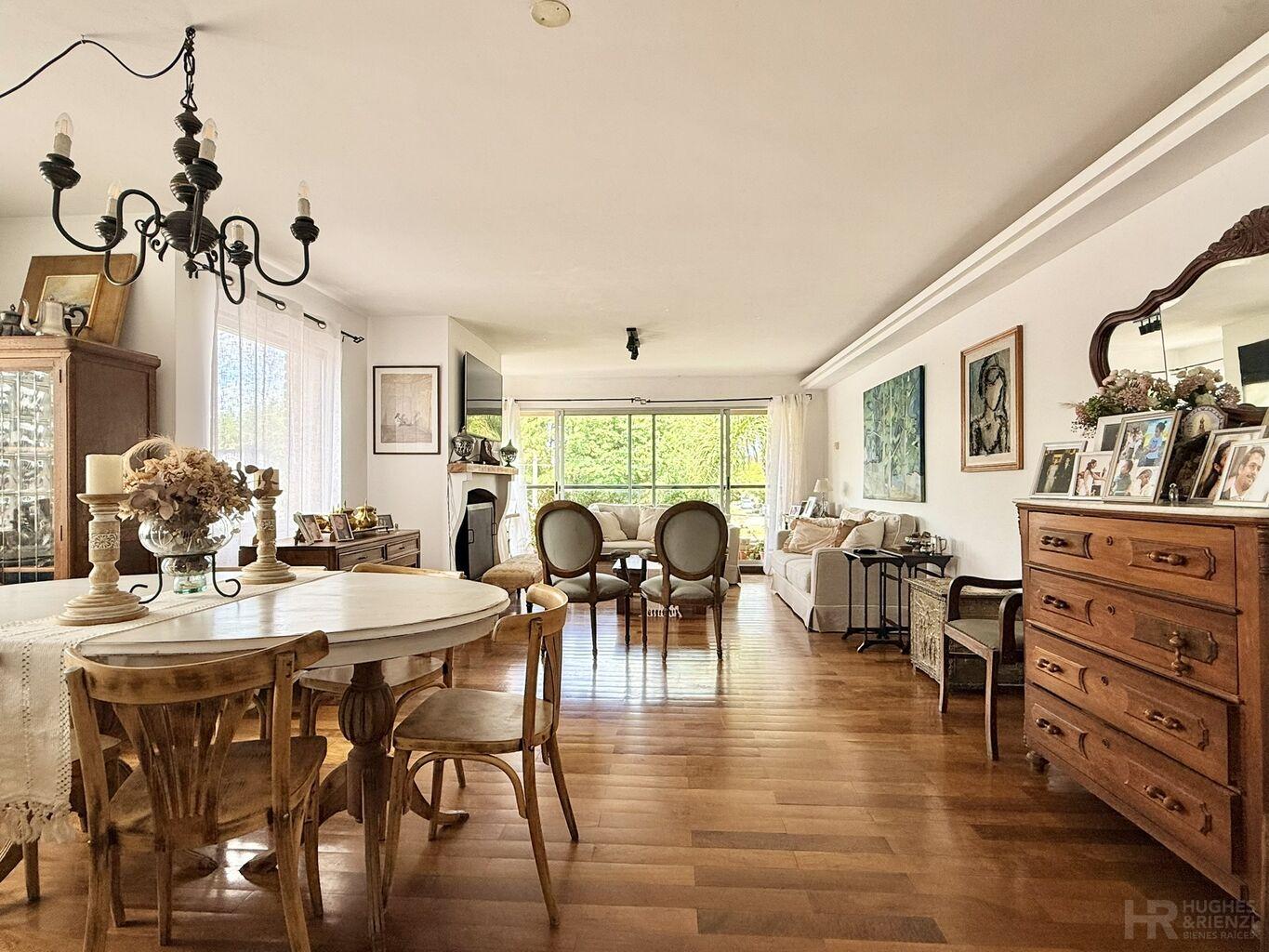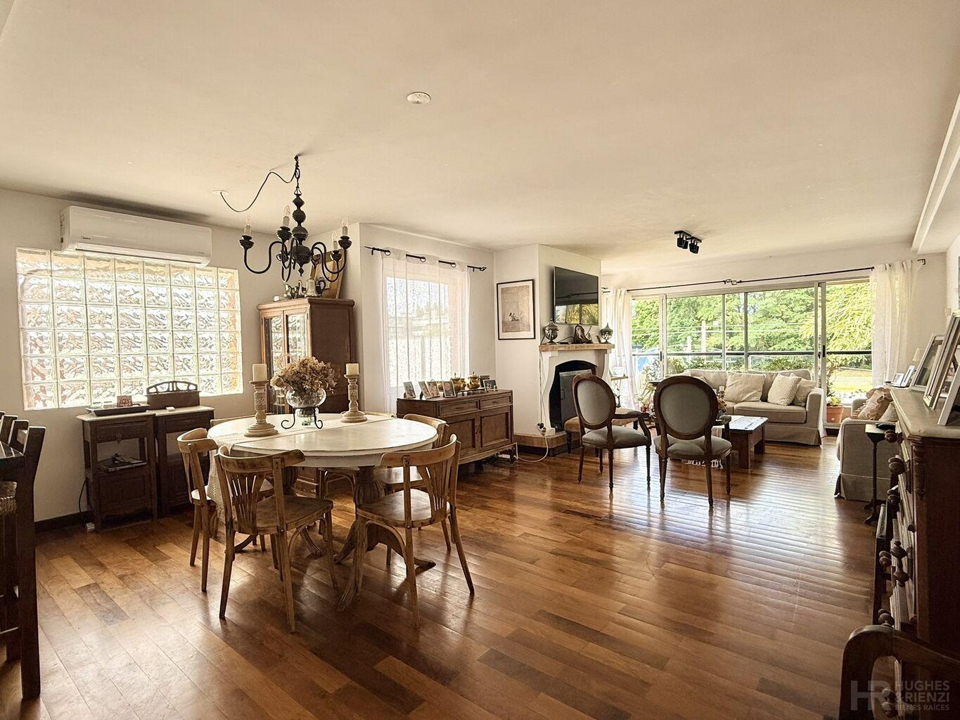 Amplio living comedor al frente con estufa a leña y salida a terraza.