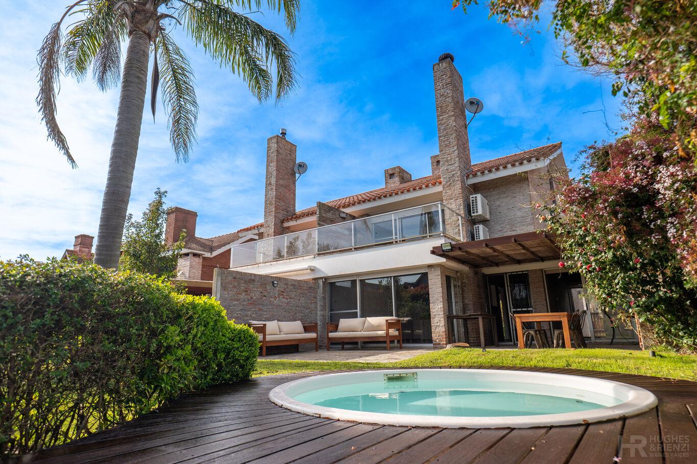 Galería techada con parrillero, piscina tipo jacuzzi y jardín con vista al lago.