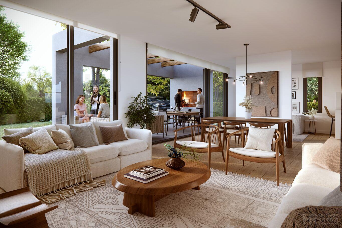 Planta Baja: amplio living comedor con grandes ventanales que integran al jardín. Cocina semi integrada con lavadero. Dormitorio. Baño completo. Jardín con pérgola y parrillero.