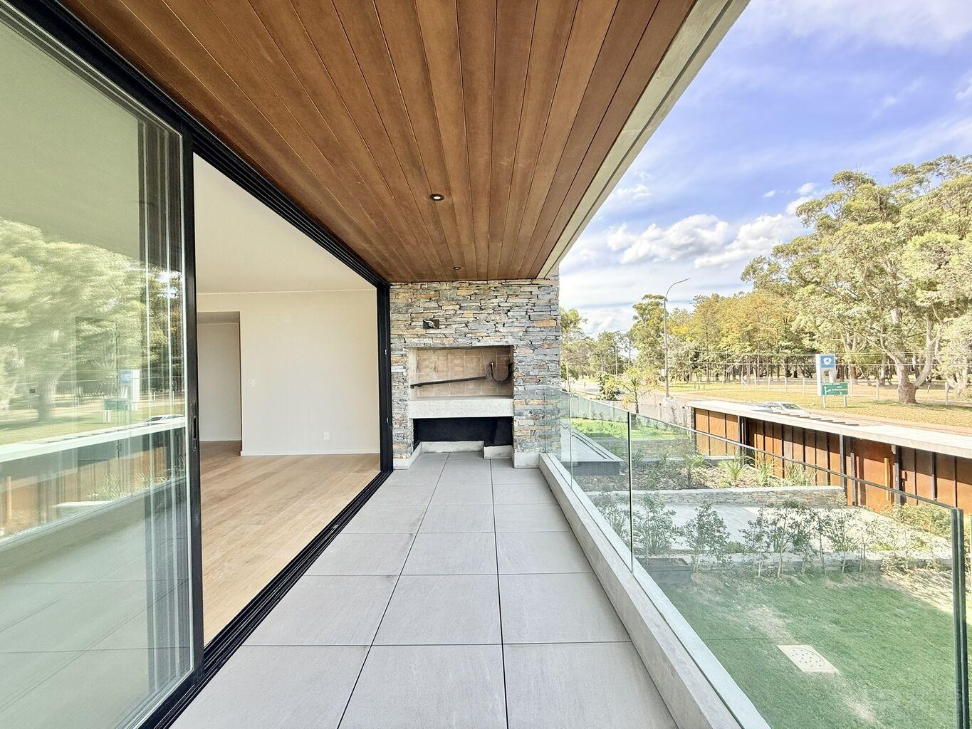Salida a terraza con parrillero y vista despejada.