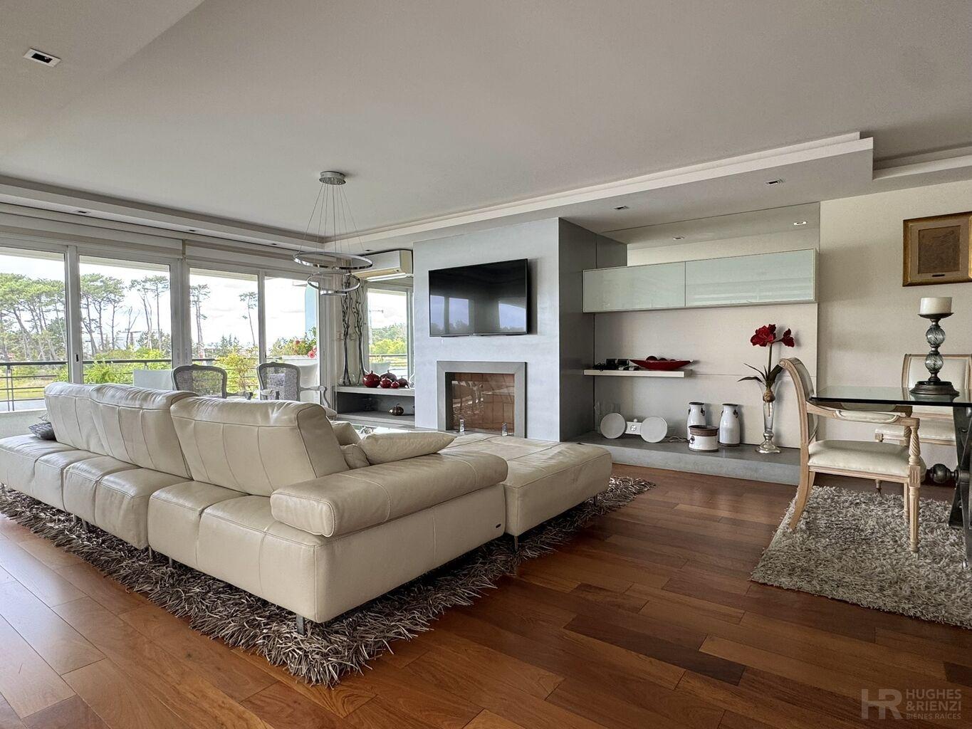 Gran living-comedor con estufa a leña, estar integrado con puertas corredizas; todo con salida a la terraza con parrillero y vista al lago.